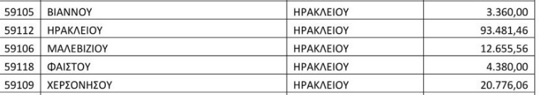 Τα ποσά που κατανεμήθηκαν στους Δήμους της ΠΕ Ηρακλείου: