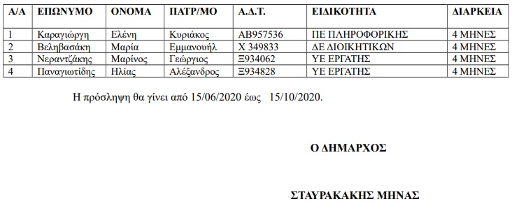 Αναρτήθηκε στη "Διαύγεια" το μεσημέρι της Πέμπτης, η απόφαση για τις τέσσερις τετράμηνες προσλήψεις στο Δήμο Βιάννου, που έγιναν στα πλαίσια της αντιμετώπισης εκτάκτων και κατεπειγουσών αναγκών λόγω του covid-19.