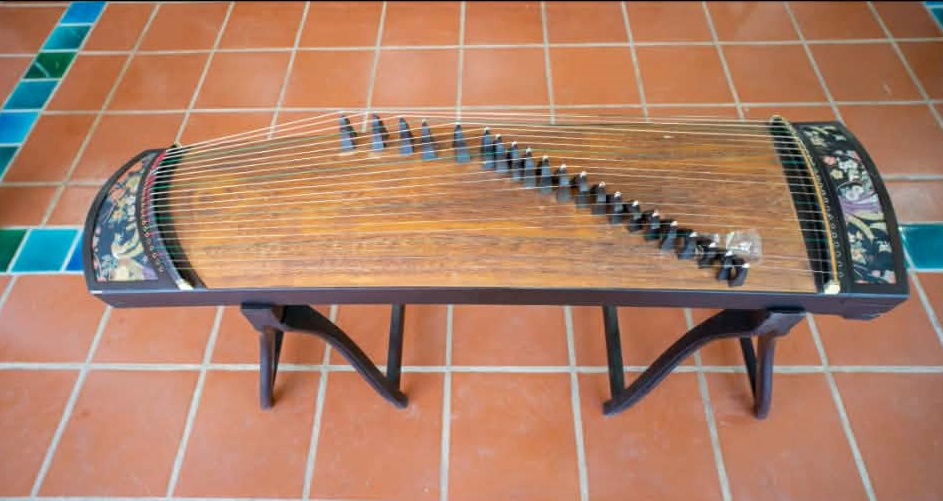 Πρόκειται για το Κινεζικό παραδοσιακό όργανο guzheng (古筝), το οποίο δανείστηκε πριν από 8-9 χρόνια μια φοιτήτρια που διέμενε στο Ηράκλειο, και από τότε δυστυχώς χάσαμε τα ίχνη της.