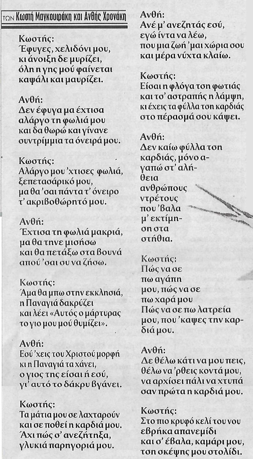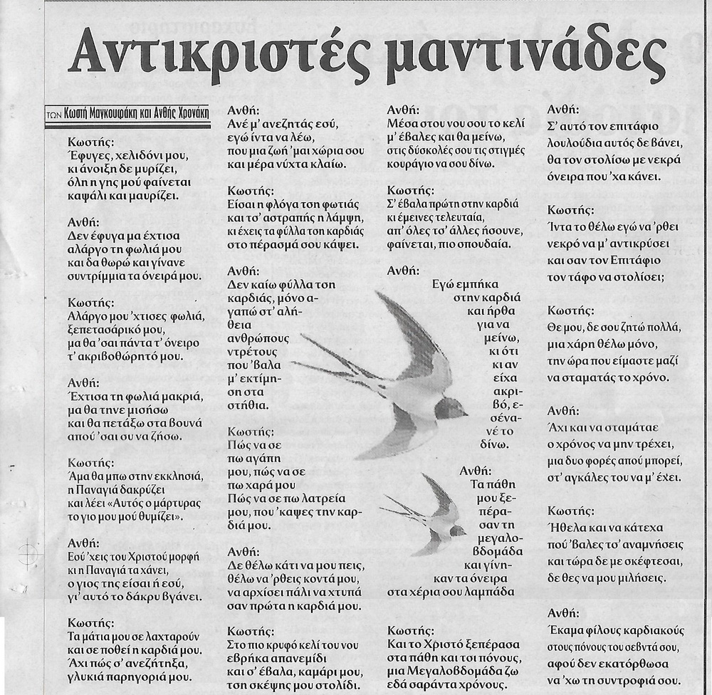 Στο φύλλο νούμερο 41 της εφημερίδας "Ηχώ της Βιάννου", που εκδόθηκε τέτοιες μέρες το 2008, ο Κωστής Μαγκουφάκης και η Ανθή Χρονάκη, μας χάρισαν κάποιες εξαιρετικές "αντικριστές" μαντινάδες.