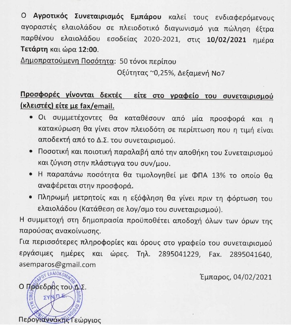 Νέο διαγωνισμό θα πραγματοποιήσει ο Αγροτικό Συνεταιρισμός Εμπάρου, αύριο Τετάρτη 10 Φεβρουαρίου και ώρα 12:00.