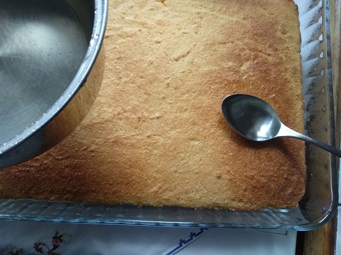Μόλις το γλυκό μας βγει από τον φούρνο ρίχνουμε κουταλιά-κουταλιά σε όλη την επιφάνειά του το σιρόπι (θα είναι ζεστό) και περιμένουμε να κρυώσει.
