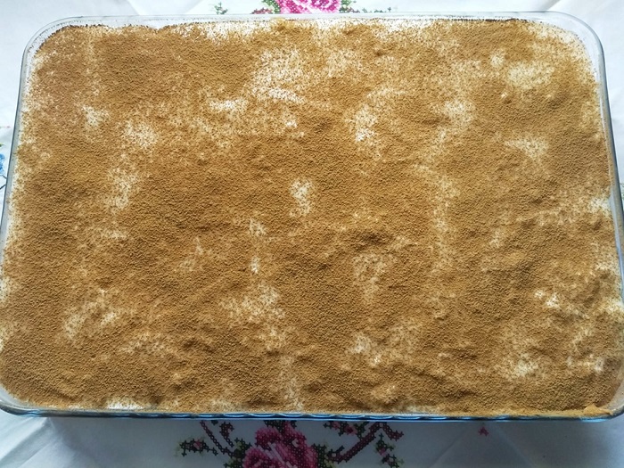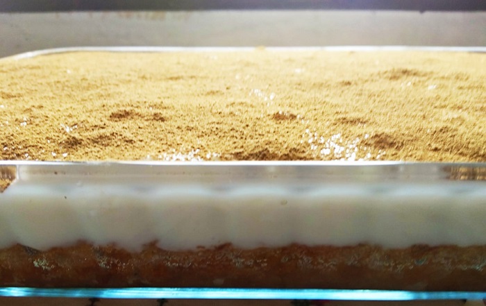 Ρίχνουμε κανέλλα στην επιφάνεια με τη βοήθεια μιας μικρής σήτας. Κρατάμε αρκετή κανέλλα για το σερβίρισμα επί πλέον, μιας και η στρώση κανέλλας η απλωμένη πάνω στο γλυκό θα υγρανθεί με την παρέλευση του χρόνου αλλά και εξαιτίας της παραμονής του γλυκού στο ψυγείο.