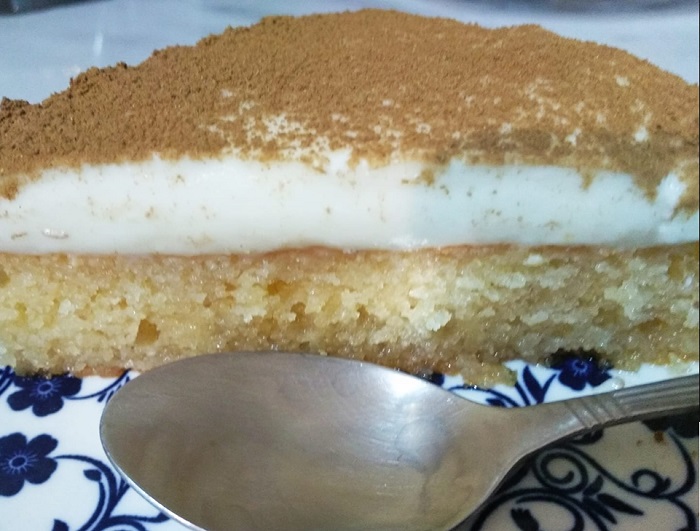 Εντυπωσιάστηκα και από την απλότητά του αλλά και από το άρωμά του. Ήταν ένα γλυκό με υπερβολικά πολλή κανέλλα στην επιφάνεια του, που μύριζε έντονα μαχλέπι και μου θύμιζε το εκμέκ της Πόλης, που γίνεται με σιροπιασμένο τσουρέκι.