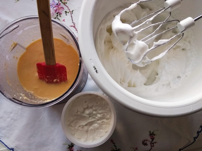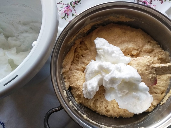 Χτυπάμε τα ασπράδια σε σφικτή μαρέγκα και την προσθέτουμε στο μίγμα των υπόλοιπων υλικών ανακατεύοντας ελαφρά με κινήσεις από κάτω προς τα πάνω (όπως στο κέικ).