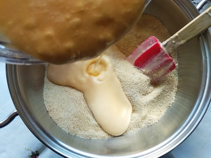 Ρίχνουμε στα στερεά υλικά το μίγμα των κρόκων και ανακατεύουμε με την σπάτουλα καλά.