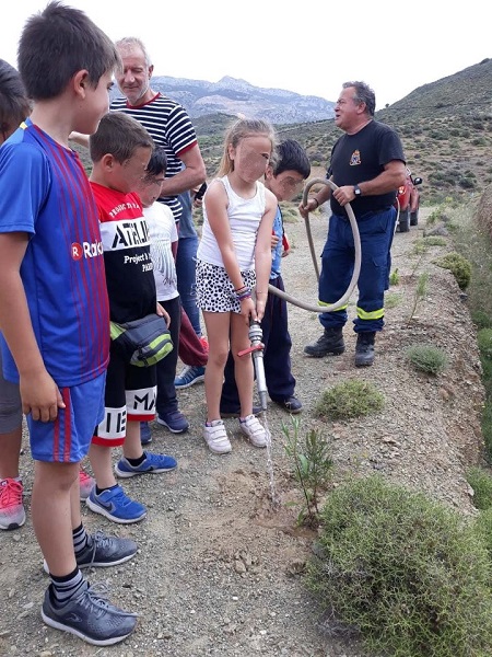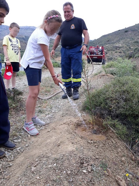 Τα παιδιά, τα οποία συνδύασαν το παιχνίδι στο γήπεδο με μια οικολογική δράση, βοήθησαν οι άνδρες της Πυροσβεστικής στο πότισμα των δέντρων, καθώς ακόμα δεν είναι έτοιμο το σύστημα ποτίσματος.