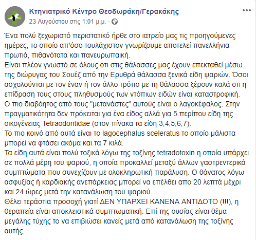 Εφόσον πλέον το ψάρι αυτό έχει κατακλύσει τις θάλασσες μας, ήταν θέμα χρόνου να τύχει κάποιο ζώο να δηλητηριαστεί από αυτό.