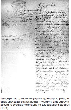 «Τα χωρία Ρούσης Κεφάλας στερούνται τακτικών αλληλοδιδακτικών σχολείων δι’ έλλειψιν μέσων προς διατήρησιν διδασκάλων και οι κάτοικοι διατελώσιν εν παχυλωτάτη αμαθεία»