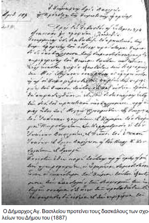 Το 1881 με έγγραφό τους, κάτοικοι του Αγίου Βασιλείου εκφράζουν τα παράπονά τους προς τη Δημογεροντία «για το μη διορισμό δασκάλου ».Οι κάτοικοι όμως προσέλαβαν ιδιωτικό δάσκαλο τον επόμενο χρόνο (1882).