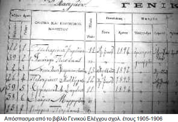 Οι περισσότεροι γονείς είναι γεωργοί πλην των γονέων των μαθητών: Ιωάν. Χρ. Μιχαλοδημητράκη (κτίστης), Μαρίας Μιχ. Πετσάκη (ξυλουργός), Μαριγώς Μιχαήλ Χατζάκη (εμποροκτηματίας), Σοφίας Εμμανουήλ Ψαράκη (ζωγράφος), Ιωάν. Εμ. Πετσάκη (κτίστης), Ευπρ. Στυλ. Βαρδάκη (κτηματίας), Αικ. και Νικ. Μύρ. Καλλέργη (ξυλουργός), Εμ. Κ. Κεφαλάκη (χαλκέος), Μιχ. & Γεωργ. Ιωάννη Χουλάκη (διδασκάλου του Σχολείου, από Καλάμι ), Ανδρ. Ι. Φραγκιαδουλάκη (μεταπράτης), Σοφία Ιωάννη Ιερέως (ιερεύς), Παν. Κ. Παξιμάδης (χαλκεύς), Μίνως Στυλ. Πολένης (έμπορος), Μαρία Αγγ. Στεφανάκη (ξυλουργός), Εμ. Ματθ. Βραχνάκης (σιδηρουργός στο Κεφαλοβρύσι), Ι. Χαραλ. Τζανάκης (διδάσκαλος). Το σχολ. έτος 1903-04 εγγράφονται 70 μαθητές (άρρενες 43 και 27 θήλεα), στις τάξεις Α (31), Β (13), Γ(16) και Δ (10). Προάγονται 31, απορρίπτονται 39 μαθητές. Ανάμεσα στους προαχθέντες είναι και 5 μαθήτριες. Σχολ. Έτος 1904-1905 Οι εγγραφέντες μαθητές διπλασιάζονται περίπου σε σχέση με το προηγούμενο έτος, ανερχόμενοι στους 136. Απ’ αυτούς οι 79 είναι αγόρια και 57 τα κορίτσια. Τα κορίτσια εγγράφονται στο Μαθητολόγιο στη σειρά, από 15-17/9, σχεδόν όλα (48) στην Α τάξη, 5 στη Β και 4στη Γ. Συνολικά εγγράφονται στις τάξεις Α (102), στη Β (14), στη Γ(8) και στη Δ (12) μαθητές. Σε 10 μαθητές και μαθήτριες υπάρχει η ένδειξη « μη πληρώσας το χαρτόσημο». Σύμφωνα με το Βιβλίο Ελέγχου φαίνονται εγγεγραμμένοι 78 μαθητές. Δάσκαλος ο Ιωάννης Γαλανάκης. Από αύξοντα αριθμό 47 -78 δεν υπάρχει βαθμολογία (μάλλον απερρίφθησαν). Προήχθησαν 41 μαθητές. Σχολ. Έτος 1905-1906Εγγράφησαν 119 μαθητές και μαθήτριες. Αγόρια 67, κορίτσια 52.Εδίδαξαν οι δάσκαλοι Ι. Γαλανάκης και Χαράλ. Τζανάκης. Σε 62 μαθητές υπάρχει η ένδειξη «ουδόλως προσήλθεν» ή «απεφοίτησεν». Προήχθησαν 32 μαθητές. Σχολ. Έτος 1906-1907 Εγγράφονται 89 μαθητές από τους οποίους 81 άρρενες και 8 θήλεα. Σε 12 μαθητές έχουμε την ένδειξη «διετής ». Από τους 89 μαθητές προήχθησαν οι 35. Το σχολικό έτος 1907-1908 εγγράφονται 76 μαθητές, όλοι άρρενες. Δεν εγγράφονται θήλεα αφού την ίδια σχολική χρονιά λειτουργεί το Παρθεναγωγείο Αγίου Βασιλείου. Εγγράφονται στις τάξεις Α(35), Β (18), Γ (13), Δ (9). Από τους 76 προήχθησαν 38 μαθητές. Το σχολ. έτος 1908-1909 εγγράφονται 90 μαθητές (όλοι άρρενες). Εγγράφονται στις τάξεις Α (42), Β (14), Γ(19) και Δ (15). Οι μαθητές που επαναλαμβάνουν την τάξη είναι 31 σχεδόν όλοι από την Α΄τάξη. Προήχθησαν 46 μαθητές.