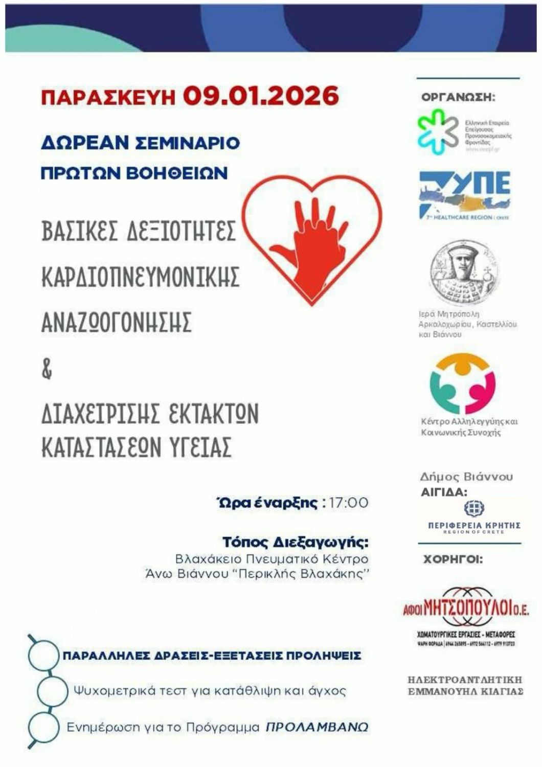 Στο πλαίσιο της συνολικής προσπάθειας που καταβάλλουμε, πραγματοποιείται και το συγκεκριμένο σεμινάριο, με την συνεργασία και υποστήριξη του Κέντρου Αλληλεγγύης και Κοινωνικής Συνοχής, την Ιερά Μητρόπολη Αρκαλοχωρίου, Καστελλίου και Βιάννου, την 7η Υγειονομική Περιφέρεια Κρήτης και την Ελληνική Εταιρεία Επείγουσας Προνοσοκομειακής Φροντίδας στο οποίο καλούμε όλους να συμμετάσχουν», δήλωσε ο Δήμαρχος Βιάννου κ. Παύλος Μπαριτάκης.