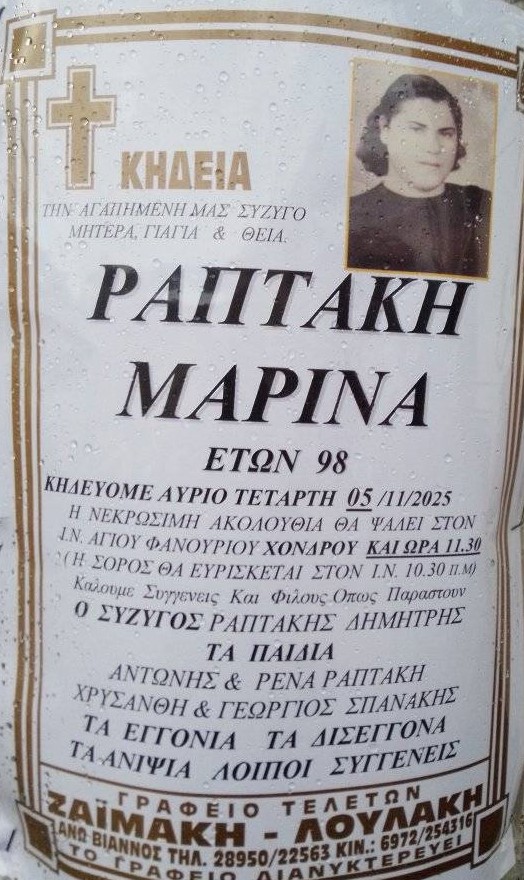 Σε ηλικία 98 ετών εγκατέλειψε τα εγκόσμια η Μαρίνα Ραπτάκη από τον Χόνδρο Βιάννου. Ήταν παντρεμένη με τον Δημήτρη Αντ. Ραπτάκη (Κωνιός) και απέκτησαν δύο καλά παιδιά. Η νεκρώσιμος ακολουθία θα ψαλλεί σήμερα Τετάρτη 5 Νοεμβρίου 2025 και ώρα 11:30 π.μ. στον Ιερό Ναό Αγίου Φανουρίου στο Χόνδρο. Η σορός θα ευρίσκεται στον ναό από τις 10:30 π.μ.