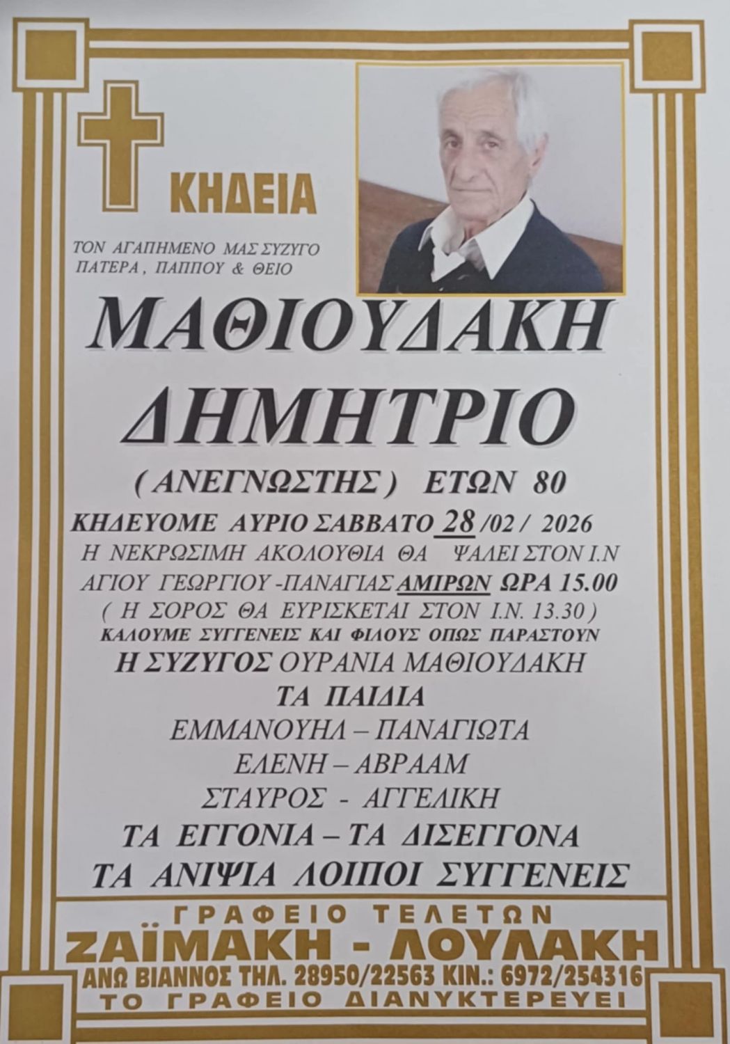 Σε ηλικία 80 ετών εγκατέλειψε τα εγκόσμια ο Δημήτρης Μαθιουδάκης από τον Αμιρά Βιάννου. Γραμματικός της κοινότητας του χωριού του μέχρι τη σύσταση του καποδιστριακού Δήμου Βιάννου. Έκτοτε ανέλαβε τη διοικητική διεύθυνση του δήμου, θέση την οποία κατείχε μέχρι και την συνταξιοδότησή του.
