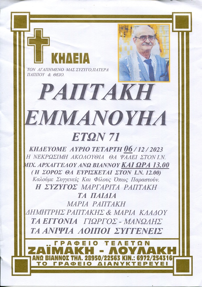 Σε ηλικία 71 ετών εγκατέλειψε τον κόσμο μας ένας καλός Βιαννίτης, ο Μάνος Δ. Ραπτάκης