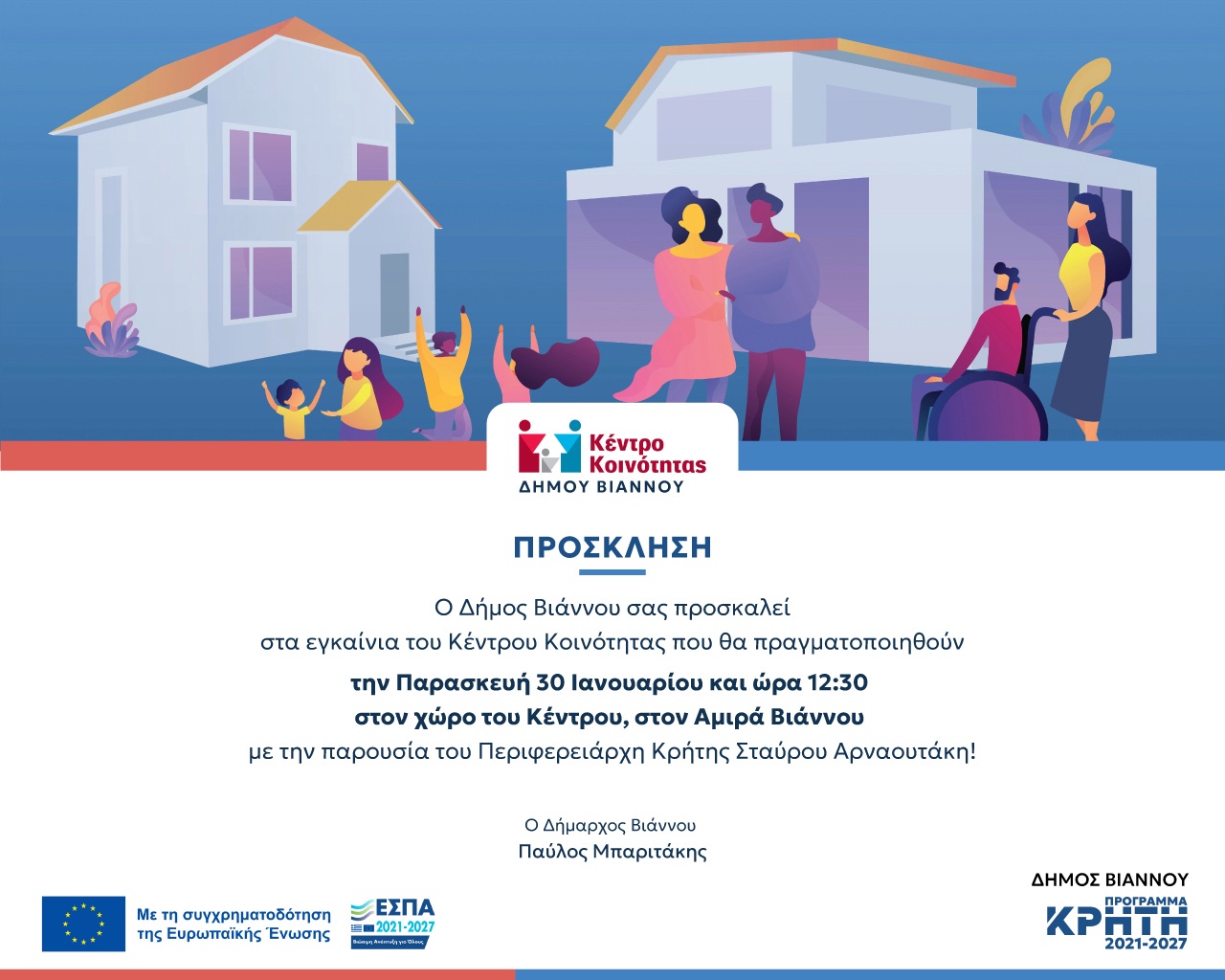 Την ερχόμενη Παρασκευή 30 Ιανουαρίου στις 12:30 μ.μ. θα πραγματοποιηθούν τα εγκαίνια του Κέντρου Κοινότητας στον Αμιρά Βιάννου.