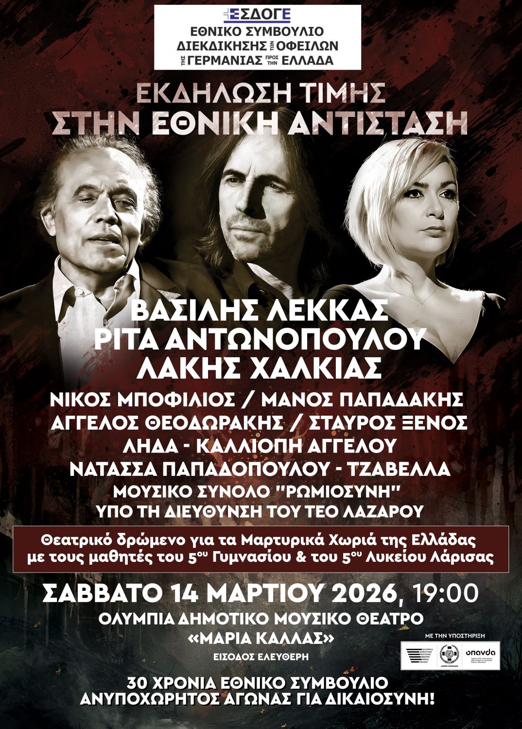 Το Εθνικό Συμβούλιο Διεκδίκησης των Οφειλών της Γερμανίας προς την Ελλάδα (ΕΣΔΟΓΕ) με την υποστήριξη του Οργανισμού Πολιτισμού Αθλητισμού και Νεολαίας του Δήμου Αθηναίων (ΟΠΑΝΔΑ) διοργανώνει Εκδήλωση Τιμής στην Εθνική Αντίσταση στο Ολύμπια, Δημοτικό Μουσικό Θέατρο «Μαρία Κάλλας», το Σάββατο στις 14 Μαρτίου 2026 και ώρα 19:00 με ελεύθερη είσοδο (θα τηρηθεί σειρά προτεραιότητας).