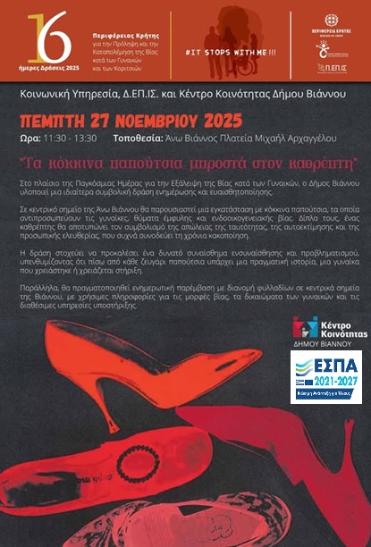 Μια ιδιαίτερα συγκινητική και συμβολική δράση πραγματοποιήθηκε στην Άνω Βιάννο στο πλαίσιο της Παγκόσμιας Ημέρας για την πρόληψη και την εξάλειψη της βίας κατά των γυναικών και των κοριτσιών. Ο Δήμος Βιάννου, σε συνεργασία με την Κοινωνική Υπηρεσία, τη Δημοτική Επιτροπή Ισότητας, το Κέντρο Κοινότητας και την Περιφέρεια Κρήτης, υλοποίησαν μία πρωτοβουλία με στόχο την ενημέρωση, την αφύπνιση και την ευαισθητοποίηση της τοπικής κοινωνίας.