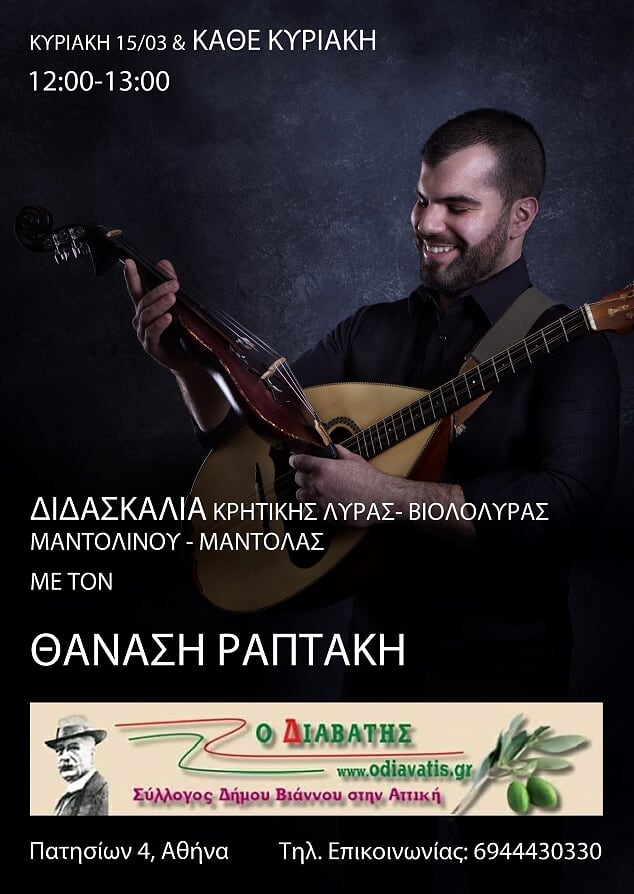Μια τέτοια πρωτοβουλία αποτελεί η "Έναρξη Μαθημάτων Κρητικών Παραδοσιακών Οργάνων" στον Διαβάτη, η οποία θα ξεκινήσει από στις 15/3 στις 12:00 κα θα πραγματοποιείται κάθε Κυριακή την ίδια ώρα.