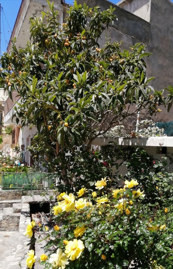 Ζουμπούλια, τριαντάφυλλα διαφόρων χρωμάτων, γιασεμιά, κρίνοι, σκυλάκια, μαργαρίτες, γεράνια, βασιλικοί, αρμπαρόριζες, και αμέτρητες ακόμη ποικιλίες ευωδιαζόντων ανθέων και φυτών κοσμούν το «αυλιδάκι» της κ. Ελένης. Πιο κει μια πανέμορφη δεσπολιά (μουσμουλιά) με τον χρυσοποίκιλτο-πεντανόστιμο καρπό της να προκαλεί σκανδαλιστικά! Σταμάτησα αθόρυβα και μυρίστηκα τις μεθυστικές ευωδιές! Όμως και μόνο που είδα τόσα όμορφα άνθη, αισθάνθηκα μιαν αφόρητη ψυχική πληρότητα!!! Ελένη σ’ ευχαριστώ πολύ για την ομορφιά που κερνάς τους περαστικούς από τον Κάτω Μύλο!!!