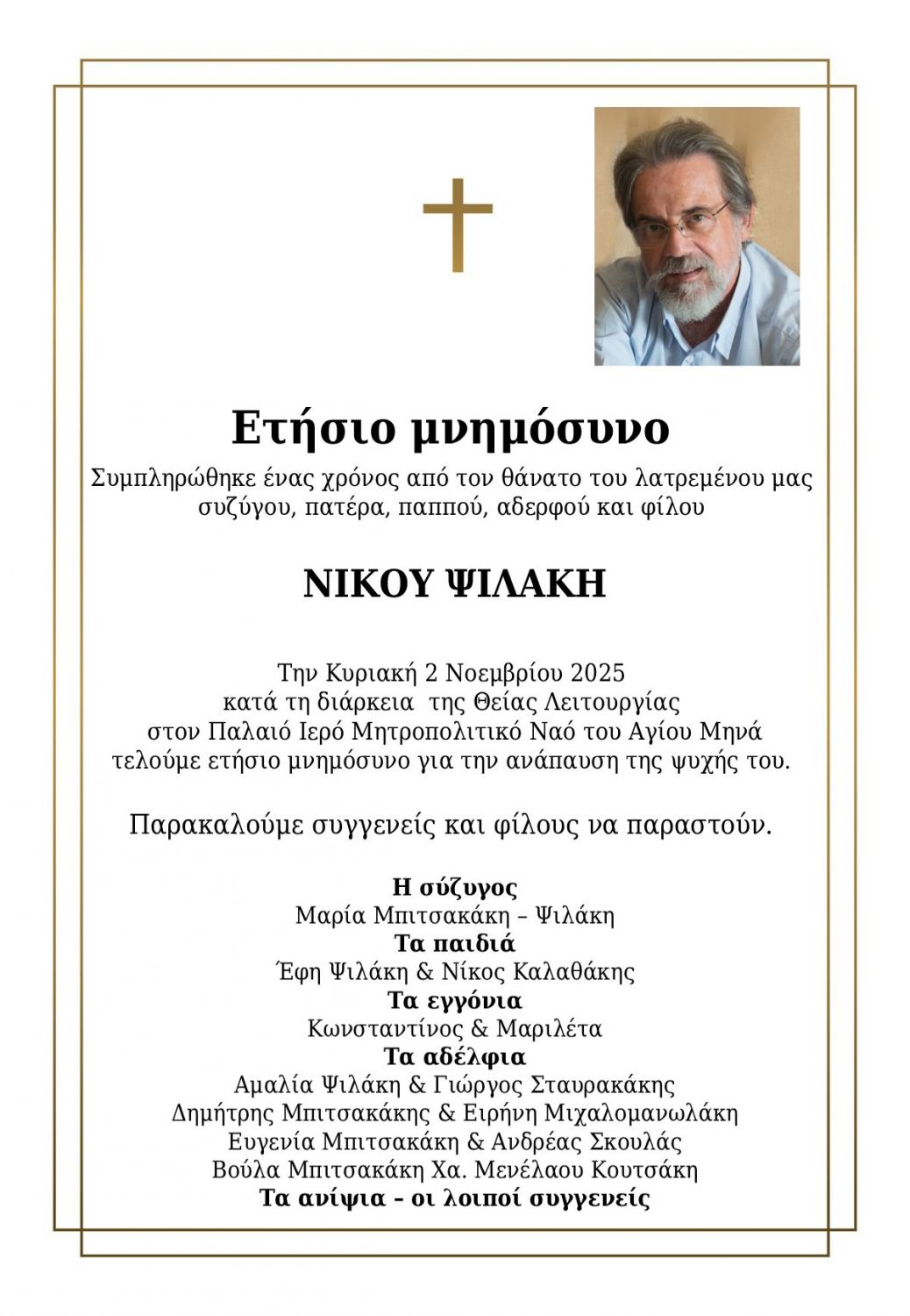 Την ερχόμενη Κυριακή 2 Νοεμβρίου 2025 συγγενείς, φίλοι και συνάδελφοι του αγαπημένου μας Νίκου Ψιλάκη, θα συγκεντρωθούμε στον Παλαιό Μητροπολιτικό Ναό του Αγίου Μηνά, στο Ηράκλειο, για να τιμήσουμε τη μνήμη του. Να τιμήσουμε τη μνήμη του ανθρώπου που η ομορφιά του κόσμου και του ανθρώπου μεγεθύνθηκε από το μεγεθυντικό φακό της σκέψης του και της ευαισθησίας του.
