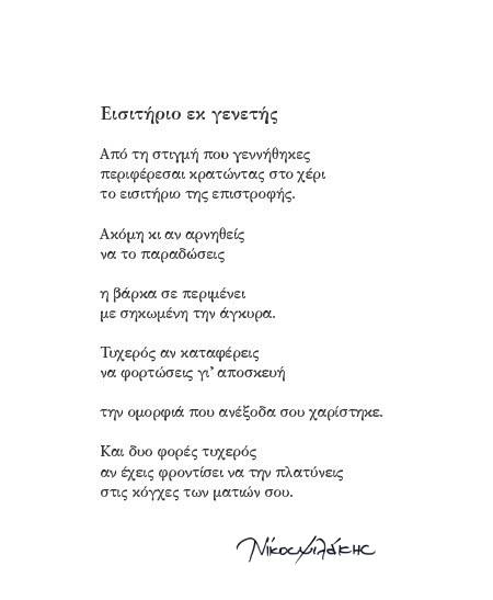 "Ο Νίκος μας έφυγε κρατώντας το δικό του εισιτήριο επιστροφής. Πήρε στις αποσκευές του την ομορφιά που του χαρίστηκε μα άφησε σ’ εμάς μεγάλα πλούτη: τη ζεστασιά, τη σκέψη, την ευγένεια, την αγάπη.