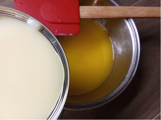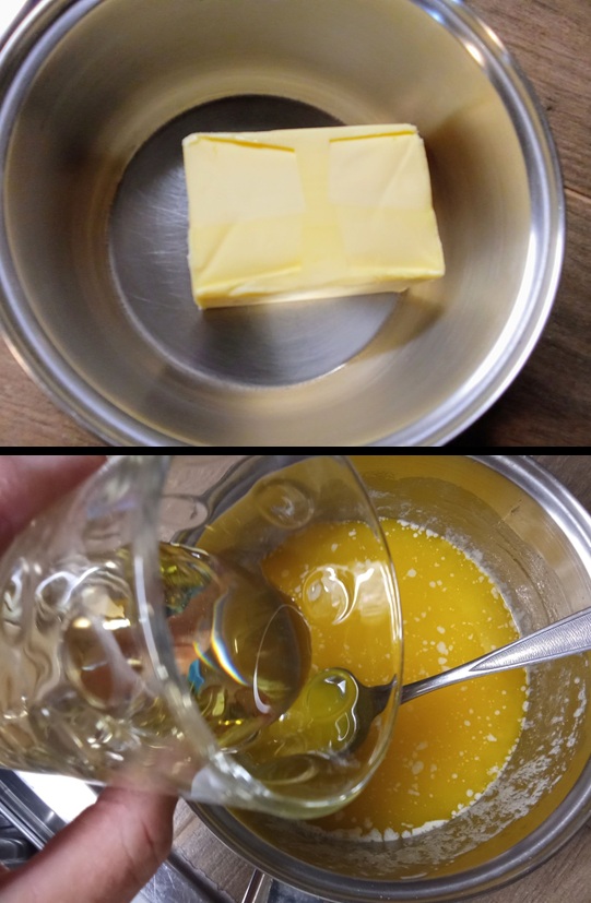 Λιώνουμε το βούτυρο και το ανακατεύουμε με το σπορέλαιο.