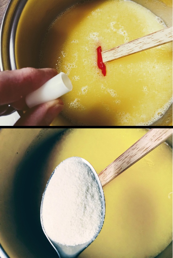 Μόλις τοποθετήσουμε το ταψί στον φούρνο, θα αδειάσουμε σε ένα μεγάλο μπολ, το βούτυρο που έχει περισσέψει (με όλα τα υγρά του), το ζαχαρούχο και θα γεμίσουμε το άδειο κουτί του τρείς (3) φορές με νερό το οποίο θα προσθέσουμε στο ζαχαρούχο.
