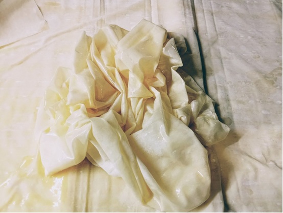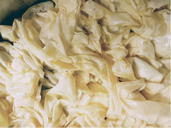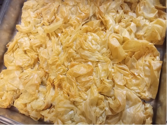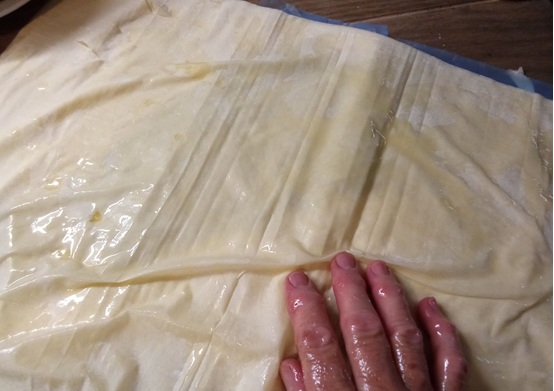 Σ’ ένα ταψί διαστάσεων 30Χ40 απλώνουμε δύο φύλλα βουτυρωμένα. Στη συνέχεια βουτυρώνουμε καλά (με την παλάμη μας βουτηγμένη στο δοχείο του βουτύρου) ένα-ένα τα φύλλα, τα τσαλακώνουμε, τα μαζεύουμε ανάλαφρα σε μια μπάλα και τα τοποθετούμε το ένα δίπλα στο άλλο μέσα στο ταψί και πάνω στα δυο στρωμένα φύλλα.