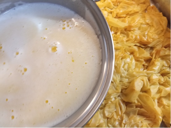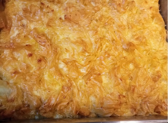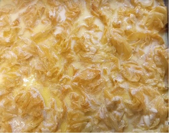Βασική διαφορά η προσθήκη σιμιγδαλιού και αυγών στο γάλα με το οποίο περιλούομε τα φύλλα κρούστας καθώς ψήνονται.