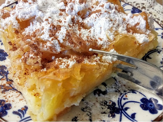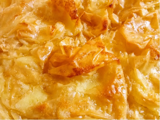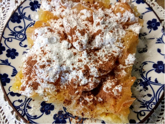 Καλά καταλάβατε ή θυμηθήκατε. Μιλώ για εκείνα τα βουτυρωμένα φύλλα κρούστας που καθώς ψηνόταν στον φούρνο τα περιλούαμε με γάλα, συνεχίζαμε το ψήσιμο και που…. ώ του θαύματος!, μας έδιναν σε λίγο μια «σχεδόν μπουγάτσα» της οποίας τη γεύση ενισχύαμε με μπόλικο πασπάλισμα άχνης ζάχαρης και κανέλλας.