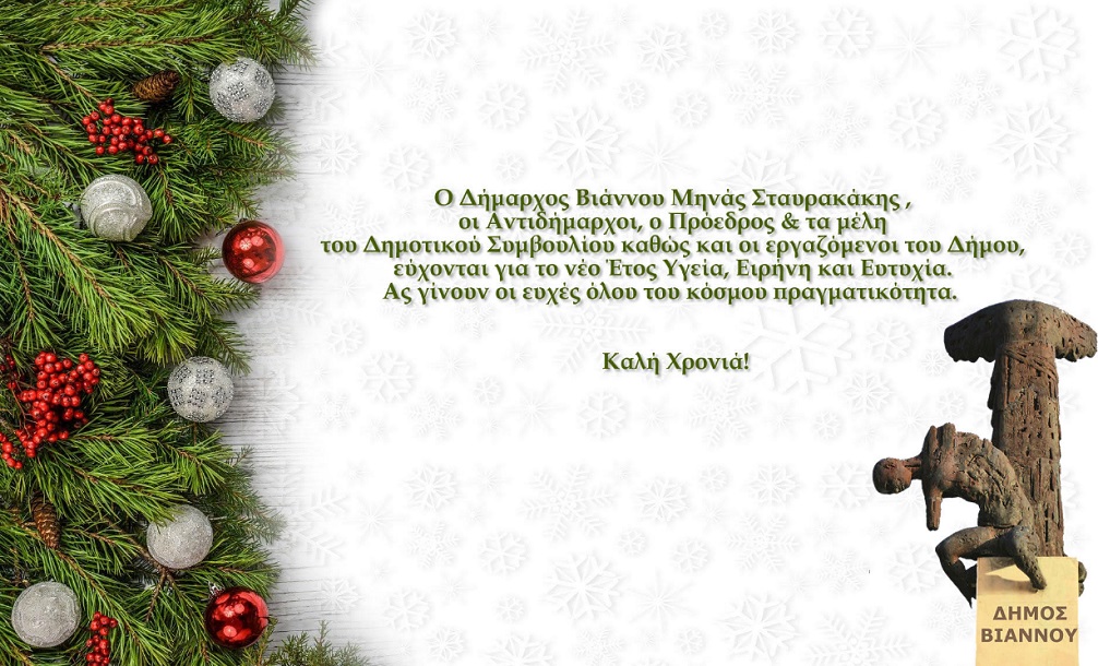 "Ο Δήμαρχος Βιάννου, Μηνάς Σταυρακάκης, οι Αντιδήμαρχοι, ο Πρόεδρος & τα μέλη του Δημοτικού Συμβουλίου καθώς και οι εργαζόμενοι του Δήμου, εύχονται για το νέο Έτος Υγεία, Ειρήνη και Ευτυχία.