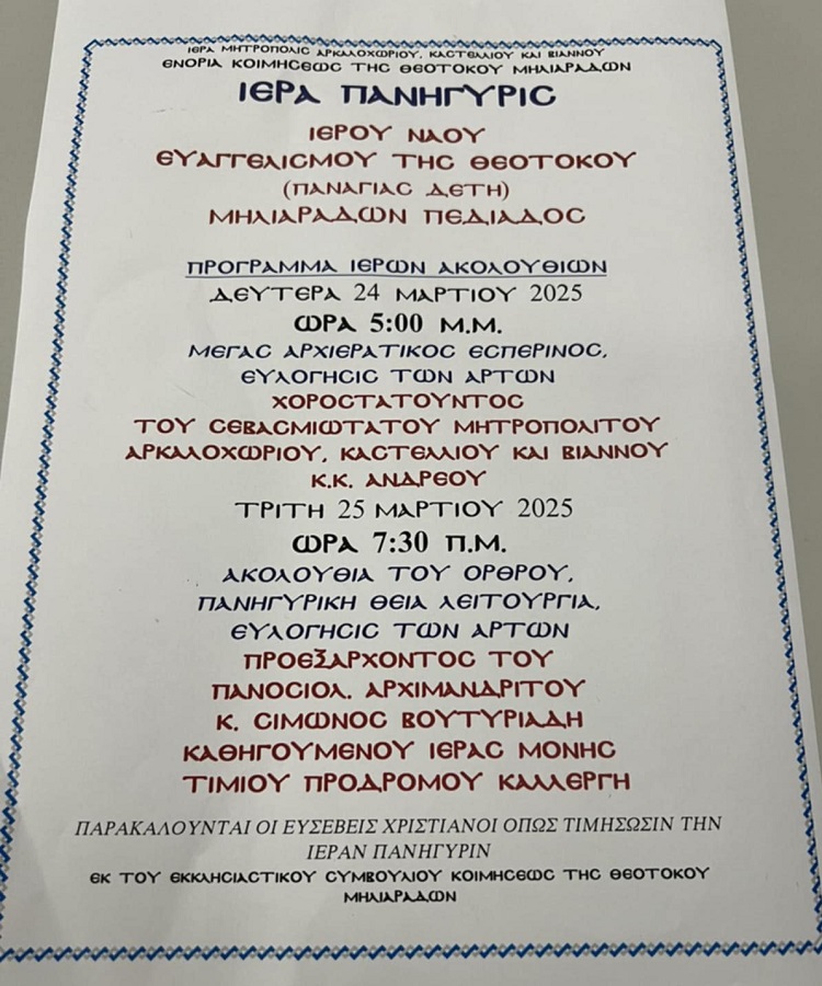 Από την Ιερά Μητρόπολη Αρκαλοχωρίου, Καστελλίου και Βιάννου έγινε γνωστό το πρόγραμμα Πανηγύρεως Παναγίας Δέτη στους Μιλλιαράδες του Δήμου Βιάννου