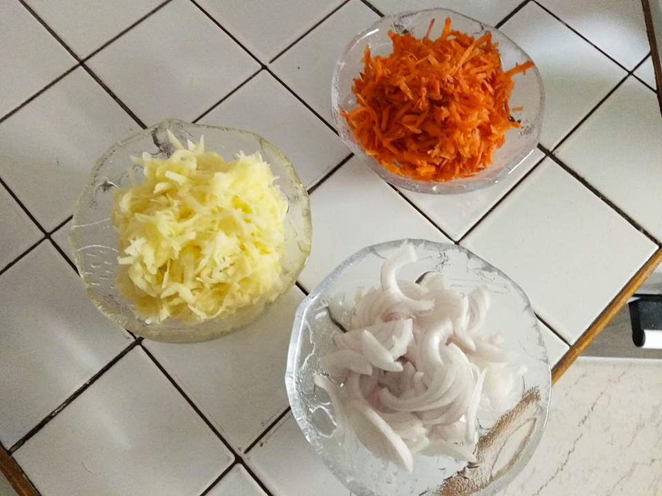 Γεμίζουμε μια μέτρια κατσαρόλα ,ως τα 3/4 της, με νερό και προσθέτουμε την τριμμένη πατάτα, το πολύ λεπτά κομμένο κρεμμύδι και το τριμμένο καρότο..Την αφήνουμε να βράζει σε χαμηλή φωτιά μέχρι να λιώσουν τα λαχανικά. Οταν τα λαχανικά χυλώσουν ,προσθέτουμε το λάδι και τους κύβους ζωμού από κρέας ,αν το συνηθίζουμε.