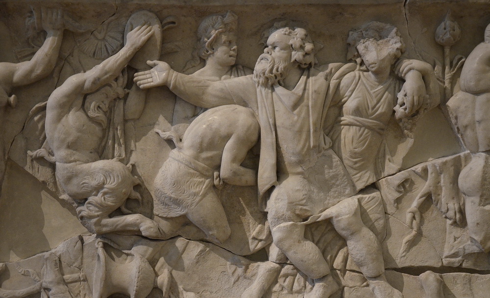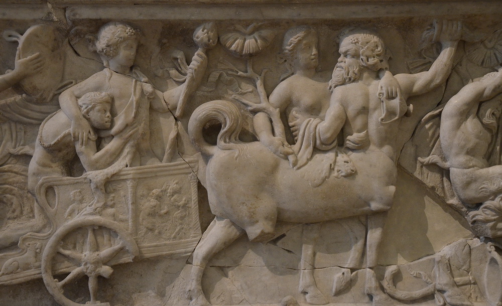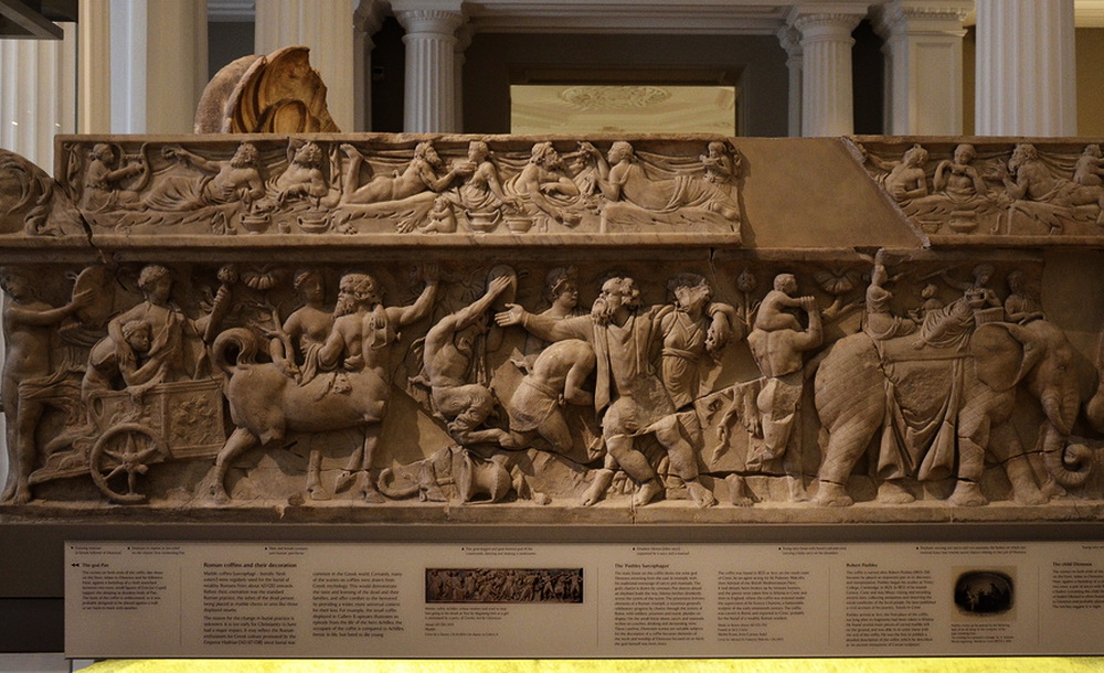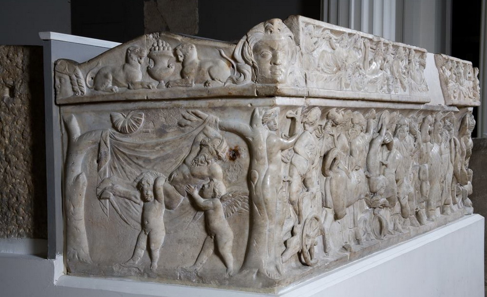 Η μαρμάρινη Σαρκοφάγος, δείχνει την θριαμβευτική επιστροφή του Διονύσου σε άρμα, από την Ανατολή. Στην ίδια παράσταση βλέπουμε Βάκχες, Σιληνούς, ελέφαντες και πάνθηρες.