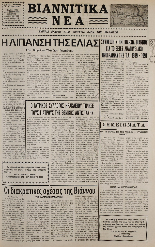 Βλέποντας το πρωτοσέλιδο της εφημερίδας "Βιαννίτικα Νέα" που αφορά τους μήνες Νοέμβριο-Δεκέμβριο του 1988, παρατηρούμε πως στην κεντρική τοπική επικαιρότητα, όπως κάθε χρόνο, βρίσκεται το λάδι, οι επιδοτήσεις και οι τιμές του.
