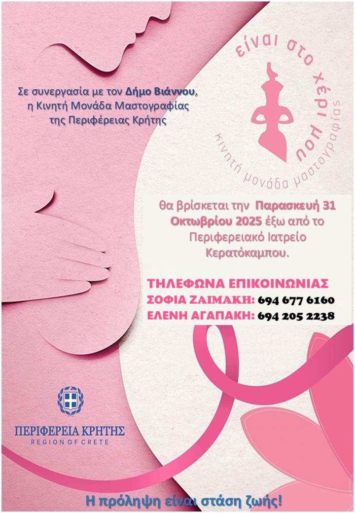 Η Κινητή Μονάδα Μαστογραφίας της Περιφέρειας Κρήτης συνεχίζει το μεγάλο της ταξίδι, ένα ταξίδι ανθρώπινο, οραματικό και γεμάτο αγάπη για τις γυναίκες. Με στόχο την ενημέρωση και την ευαισθητοποίηση γύρω από την πρόληψη του καρκίνου του μαστού, η Μονάδα θα βρίσκεται την Παρασκευή 31 Οκτωβρίου 2025, από τις 9:30 το πρωί, έξω από το Ιατρείο Κερατόκαμπου.