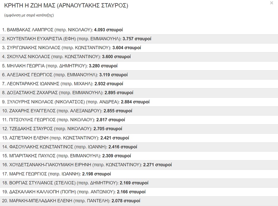 Οι 20 πρώτοι στην Περιφερειακή Ενότητα Ηρακλείου από τον συνδυασμό του Σταύρου Αρναουτάκη “Κρήτη η ζωή μας” :
