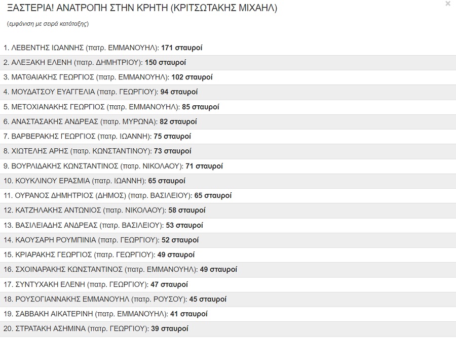 Οι 20 πρώτοι στην Περιφερειακή Ενότητα Ηρακλείου από τον συνδυασμό του Μιχάλη Κριτσωτάκη “Ξαστεριά! Ανατροπή στην Κρήτη”: