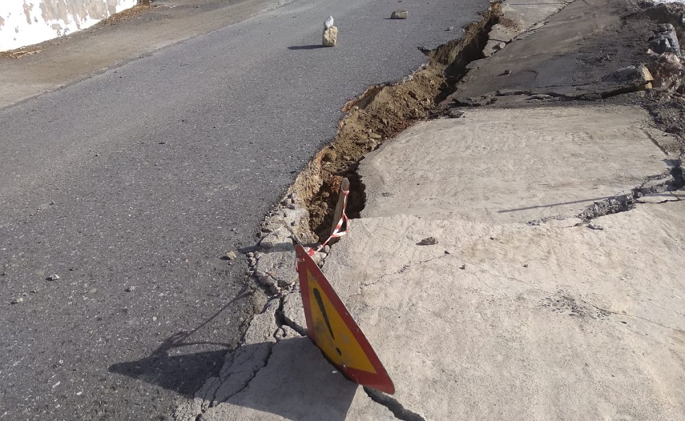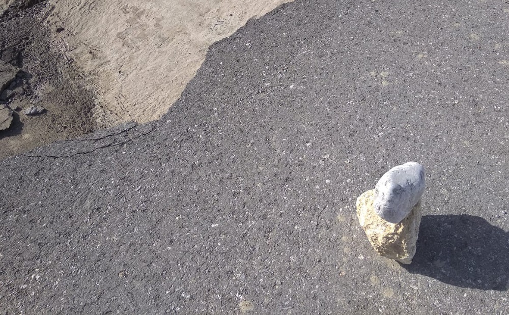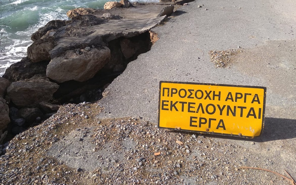 Όπως μας καταγγέλλεται, η πινακίδα κινδύνου έχει στερεωθεί μπαίνοντας μέσα στη χαραμάδα που δημιούργησε στο δρόμο η φουσκοθαλασσιά, ενώ σε άλλα σημεία που το οδόστρωμα έχει υποχωρήσει, έχουν τοποθετηθεί μικρές πέτρες για να αποτρέψουν τους διερχόμενους να πλησιάσουν.