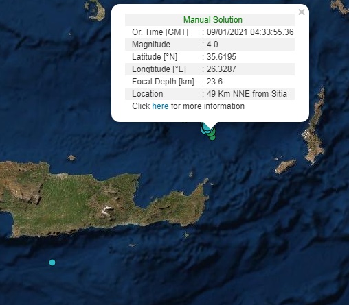 Ισχυρή σεισμική δόνηση μεγέθους 4 Ρίχτερ σημειώθηκε στις 4:33 τα ξημερώματα του Σαββάτου στη θαλάσσια περιοχή βορειοανατολικά της Κρήτης.