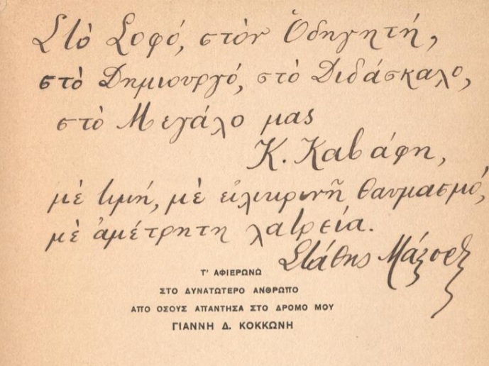 Στα ψηφιοποιημένα πρώτα φύλλα της συλλογής Τίποτε υπάρχει ιδιόχειρη αφιέρωση του συγγραφέα προς τον Κ. Καβάφη.