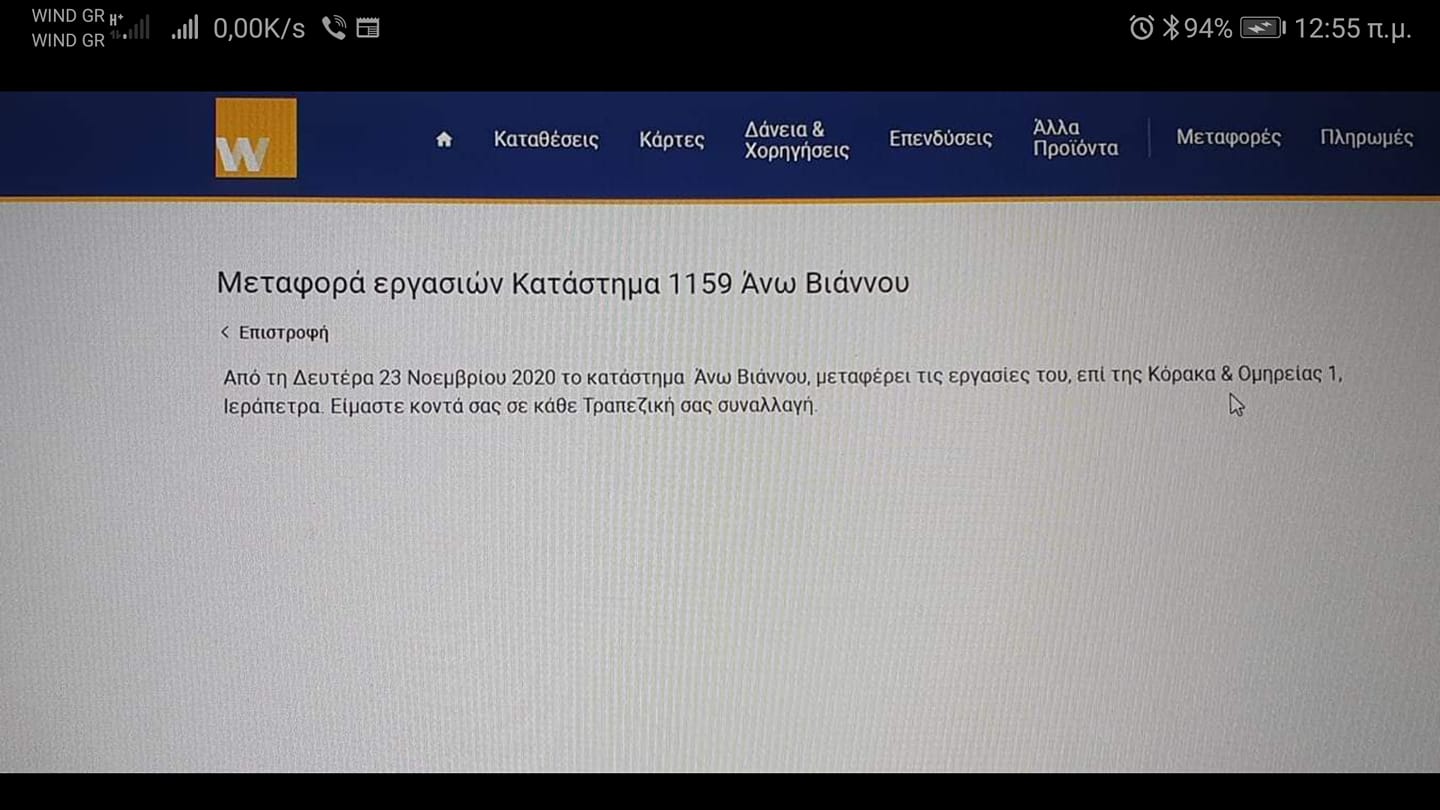 "Από τη Δευτέρα 23 Νοεμβρίου 2020 το κατάστημα, Άνω Βιάννου, μεταφέρει τις εργασίες του, επί της Κόρακας & Ομηρείας στην Ιεράπετρα. Είμαστε κοντά σας σε κάθε Τραπεζική σας συναλλαγή", αναφέρει το σύντομο μήνυμα της τράπεζας.
