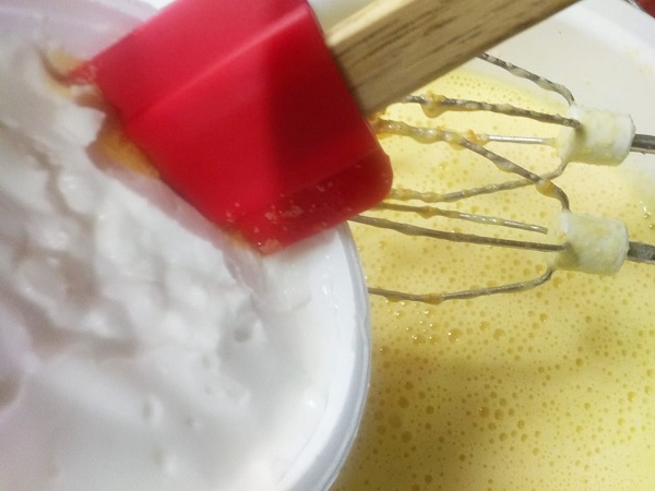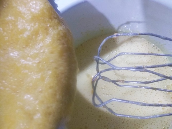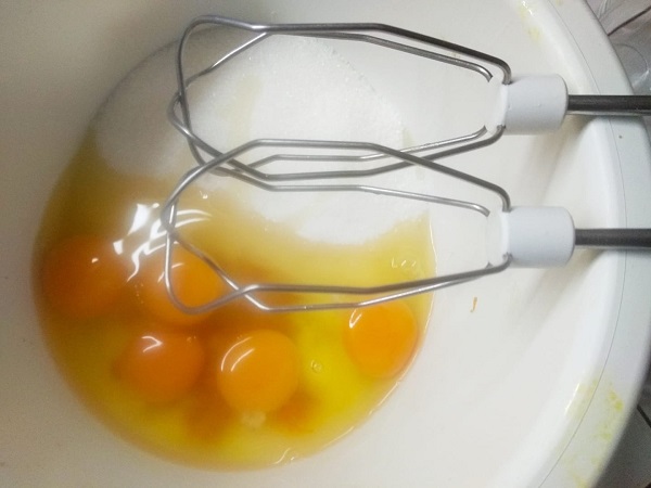 Βάζουμε στο μπολ του μίξερ το ξύσμα, τα αυγά και τη ζάχαρη και τα χτυπάμε για 5-6 λεπτά μέχρι να ασπρίσουν.