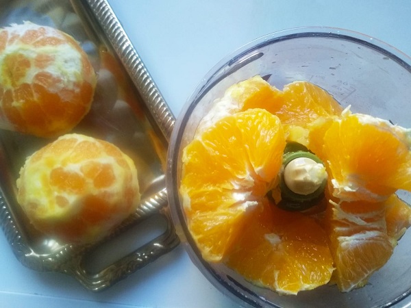 Λιώνουμε το εσωτερικό των πορτοκαλιών στο μούλτι ή με ραβδομπλέντερ.