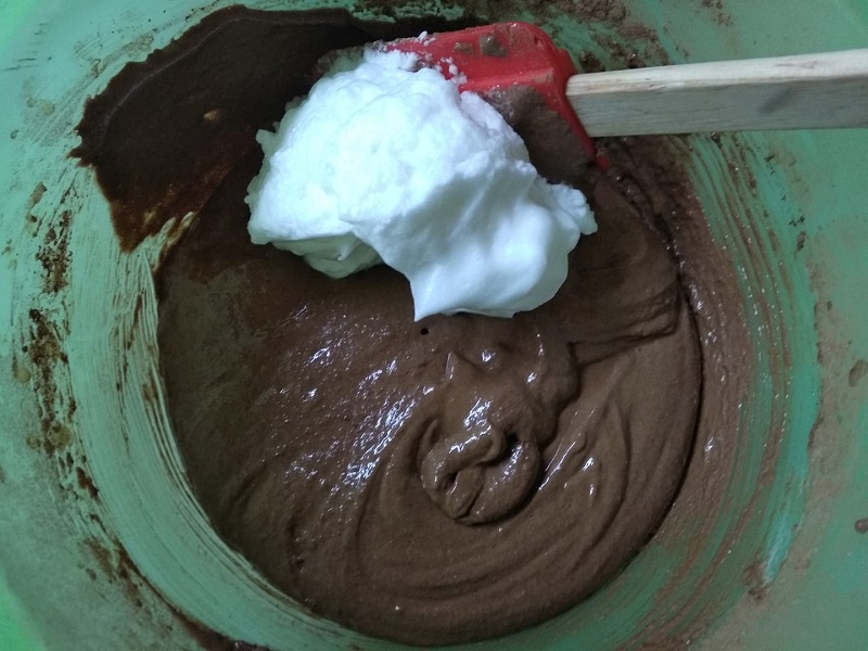 Χτυπάμε τα ασπράδια σε σφικτή μαρέγκα και τα προσθέτουμε, με δόσεις, στο μίγμα ανακατεύοντας απαλά για να μη χαθεί ο όγκος τους.
