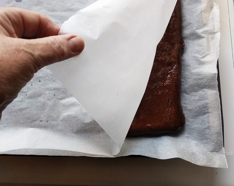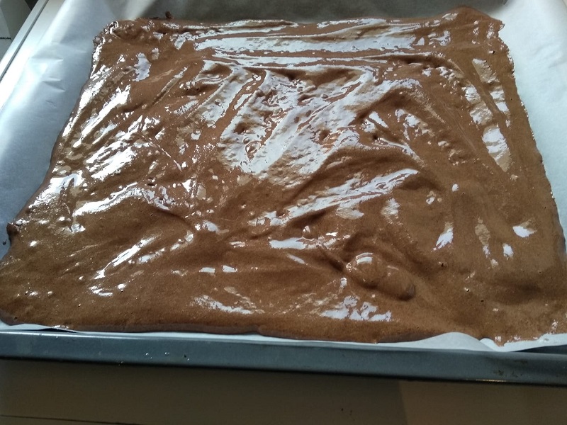 Στρώνουμε ένα μεγάλο ταψί (του φούρνου) με αντικολλητικό χαρτί και απλώνουμε το υλικό.