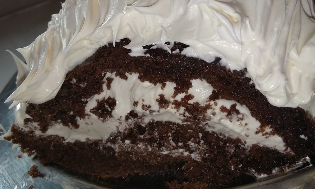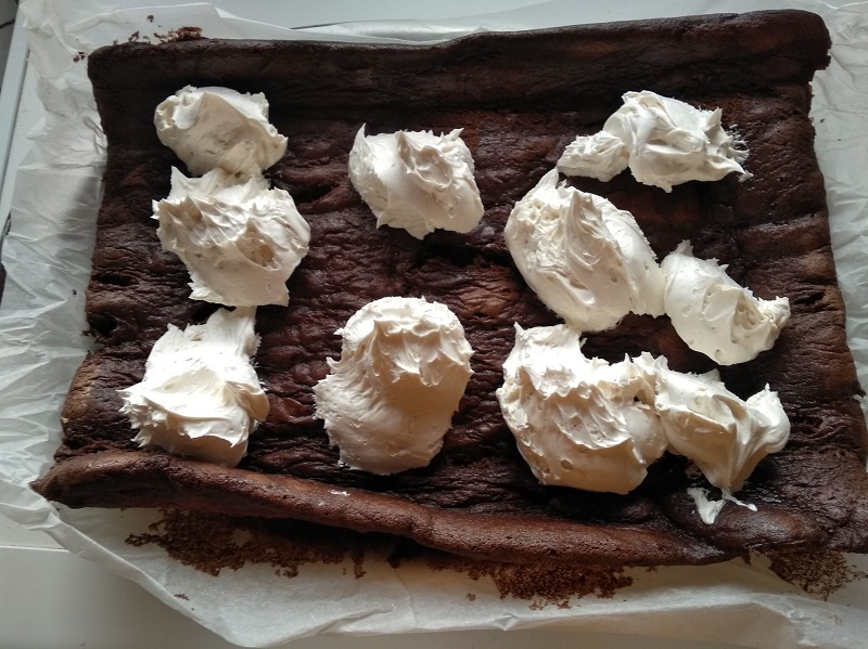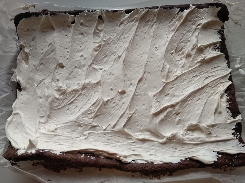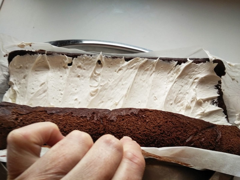 Όταν το παντεσπάνι κρυώσει εντελώς, το μεταφέρουμε σ’ ένα μεγάλο δίσκο και το ανοίγουμε προσεκτικά. Αφαιρούμε το χαρτί της πάνω επιφάνειας, βάζουμε διάσπαρτες κουταλιές τη μισή σαντιγί και την στρώνουμε.