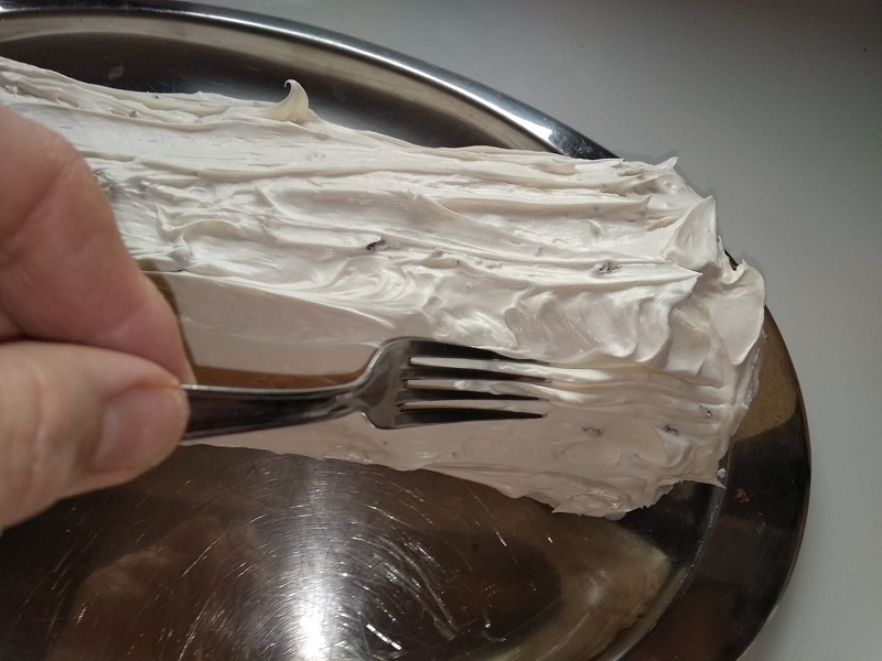 Στρώνουμε την υπόλοιπη σαντιγί στην επιφάνεια του κορμού και με τη βοήθεια ενός πιρουνιού κάνουμε αυλακιές.