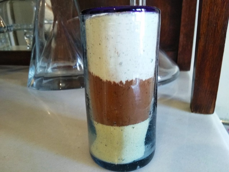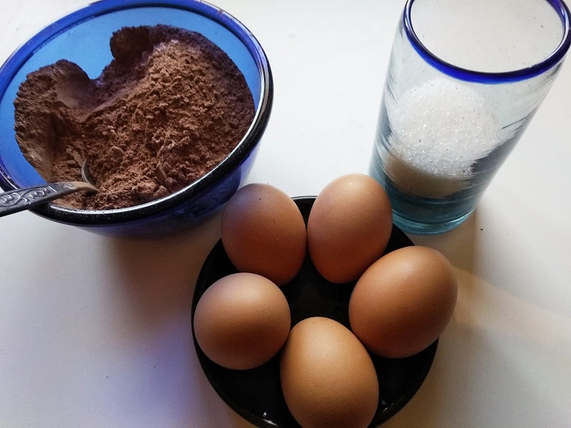 Γεμίζουμε ένα ποτήρι νερού με αλεύρι, σιμιγδάλι ψιλό και κακάο, παραχωρώντας σε καθένα από τα υλικά αυτά, το 1/3 της χωρητικότητας του ποτηριού.